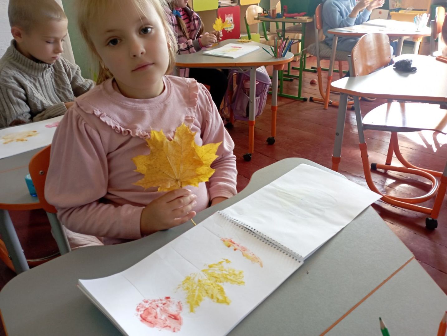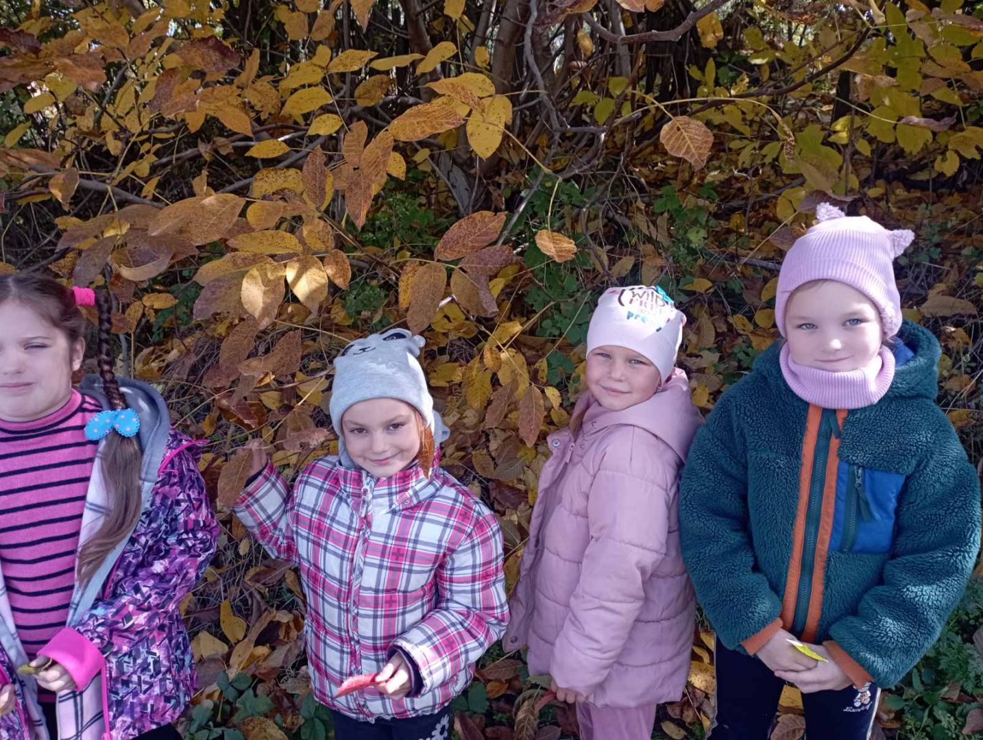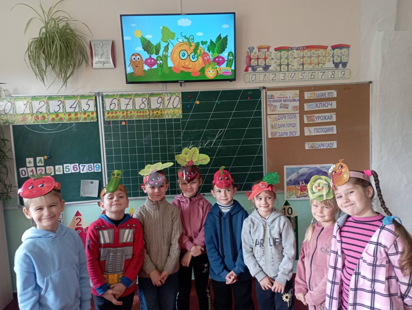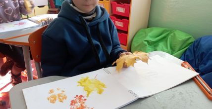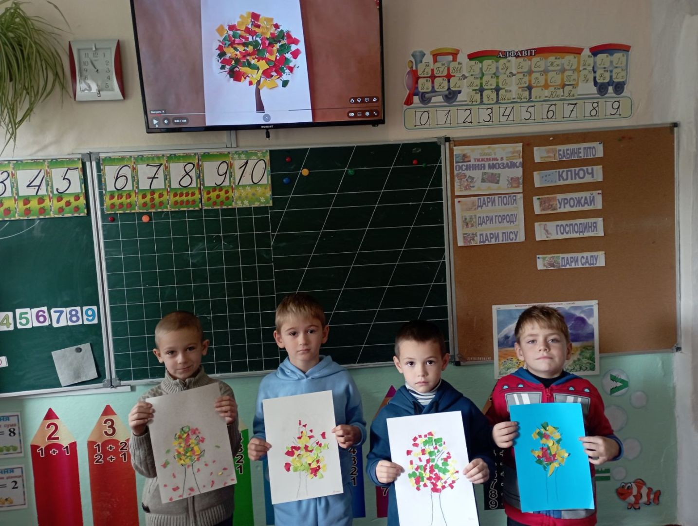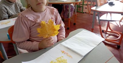 У першокласників тиждень " осіння мозаїка". Діти спостерігали, як осінь завітала у сади і парки. Були на екскурсії, збирали листочки. Малювали їх різними кольорами. Робили аплікацію осіннього дерева з рваного паперу. А ще вивчили і грали народну пісню "Ходить гарбуз по городу"