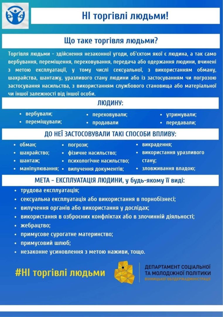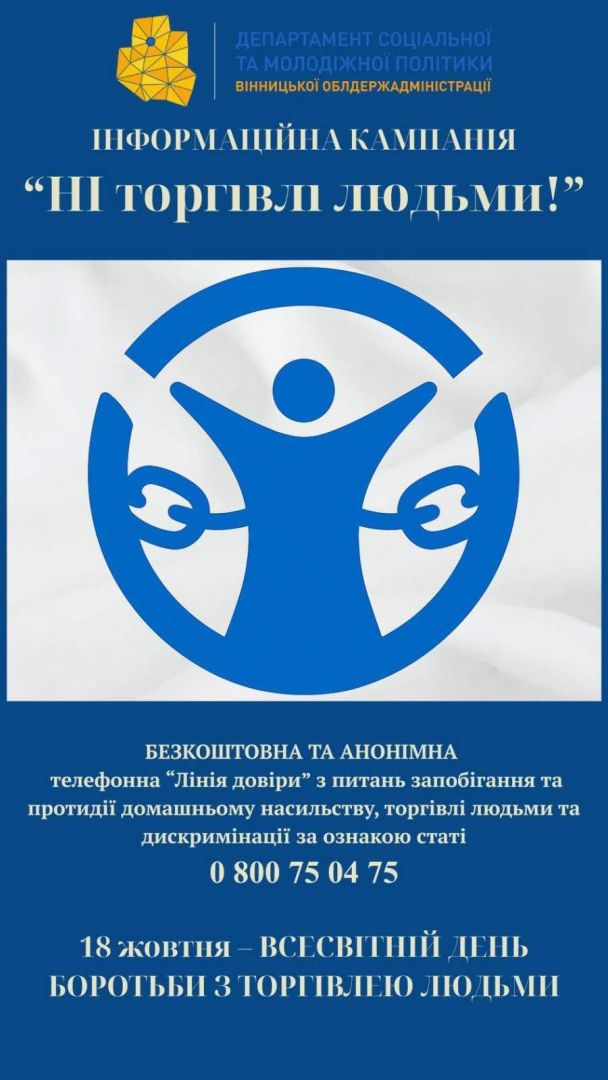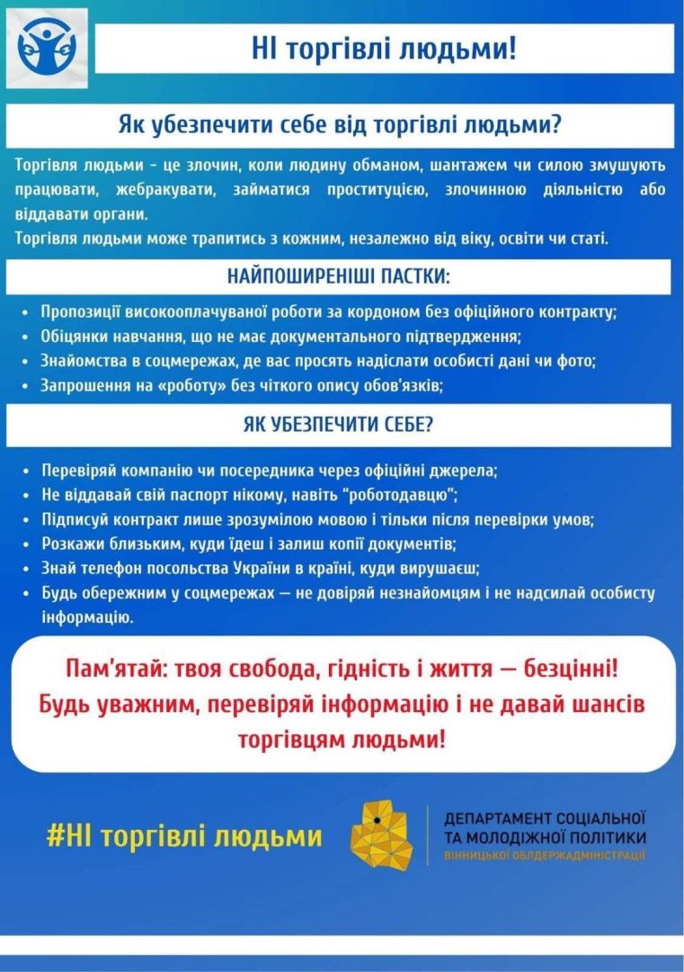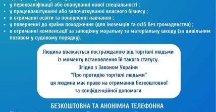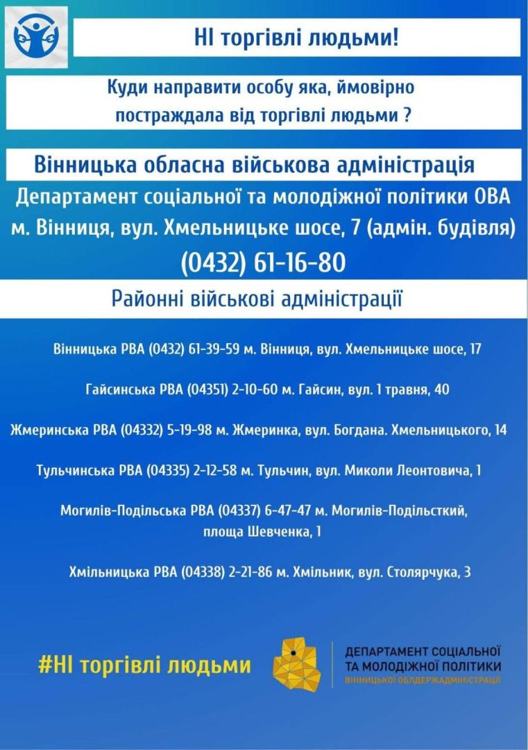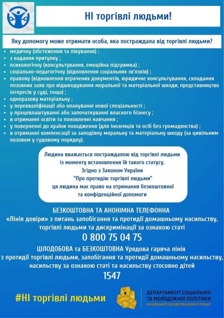 Національна гаряча лінія з протидії торгівлі людьми: 0 800 505 501 або 527 (з мобільного).